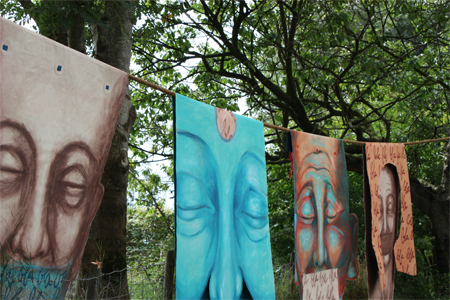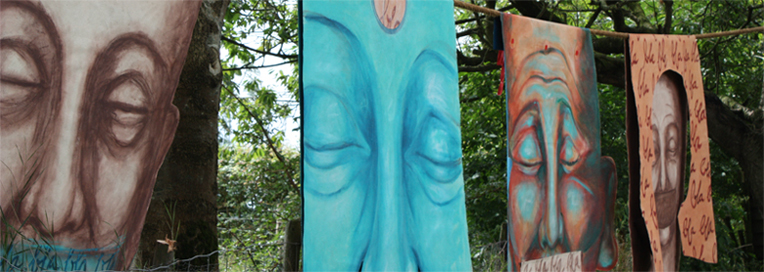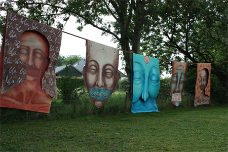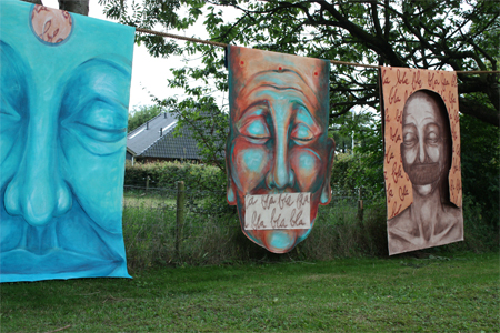 En zo begon ‘Zwichten voor Zwijgen’. Een periode waarin ik, tijdens het maken van 5 manshoge dubbelzijdige portret-vlaggen, opnieuw werd uitgenodigd me te focussen op m’n eigen tekortkomingen en momenten van ongemak. Opnieuw de gelegenheid kreeg te ervaren dat m’n inmenging lang niet altijd nodig is en vertrouwen op het leven zelf een stuk heilzamer voor m’n omgeving en mezelf. En in het verlengde daarvan, te zien dat het nu toch echt tijd wordt om m’n geconditioneerde verbale stemgeluid plaats te laten gaan maken voor een meer authentieke.