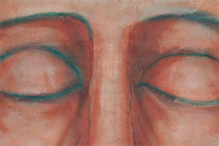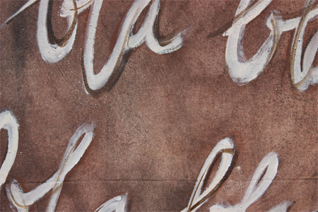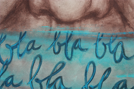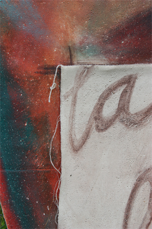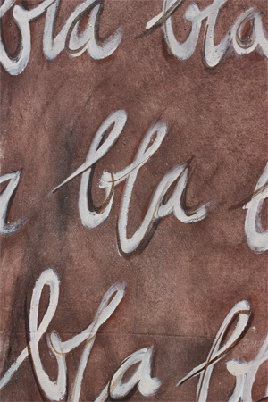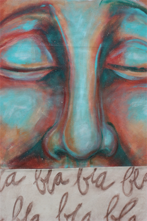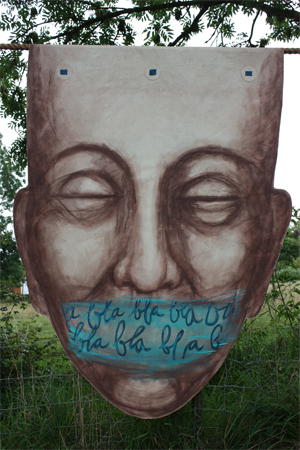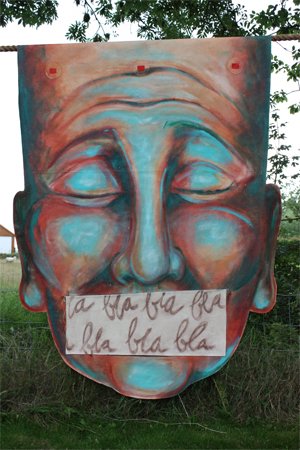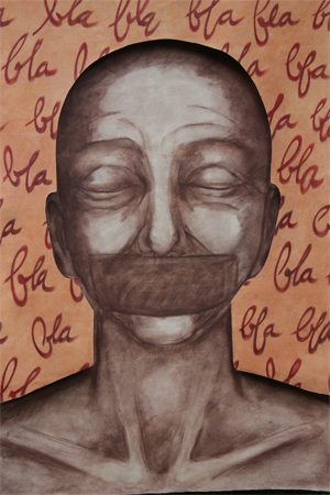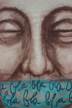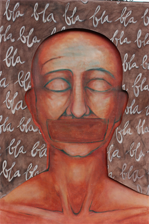 Het eerste doek in de serie ‘Zwichten voor Zwijgen’ lag tijdens de Kunst-aan-Huis-weekenden van 2010 op de grond, in het midden van m’n atelier. Het doek was als een soort vervolg ontstaan op m’n inzichten rond spreken en zwijgen van enige tijd geleden (zie ook Schrijfwerk-Wakker Worden). Met dit doek en een korte prikkelende tekst over ‘de vrijheid van niet-meningsuiting’ wilde ik de mensen tijdens die weekenden aanmoedigen om over dit onderwerp na te denken. Ik wilde ze uitnodigen om naar het gebral in zichzelf en in de huidige maatschappij te kijken, deze ter discussie te stellen en ze vervolgens laten ontdekken dat juist in een schijnbare beperking als het niet mogen of kunnen spreken wellicht meer vrijheid te ervaren valt dan in de door ons op een voetstuk geplaatste ‘vrijheid van meningsuiting’. Ik deed dat in eerste instantie vanuit een besef dat ik veel op dat terrein, o grote bescheidenheid, nu wel had gezien en mijn taak slechts was een serie te maken die dit thema onder de aandacht van derden zou gaan brengen.
